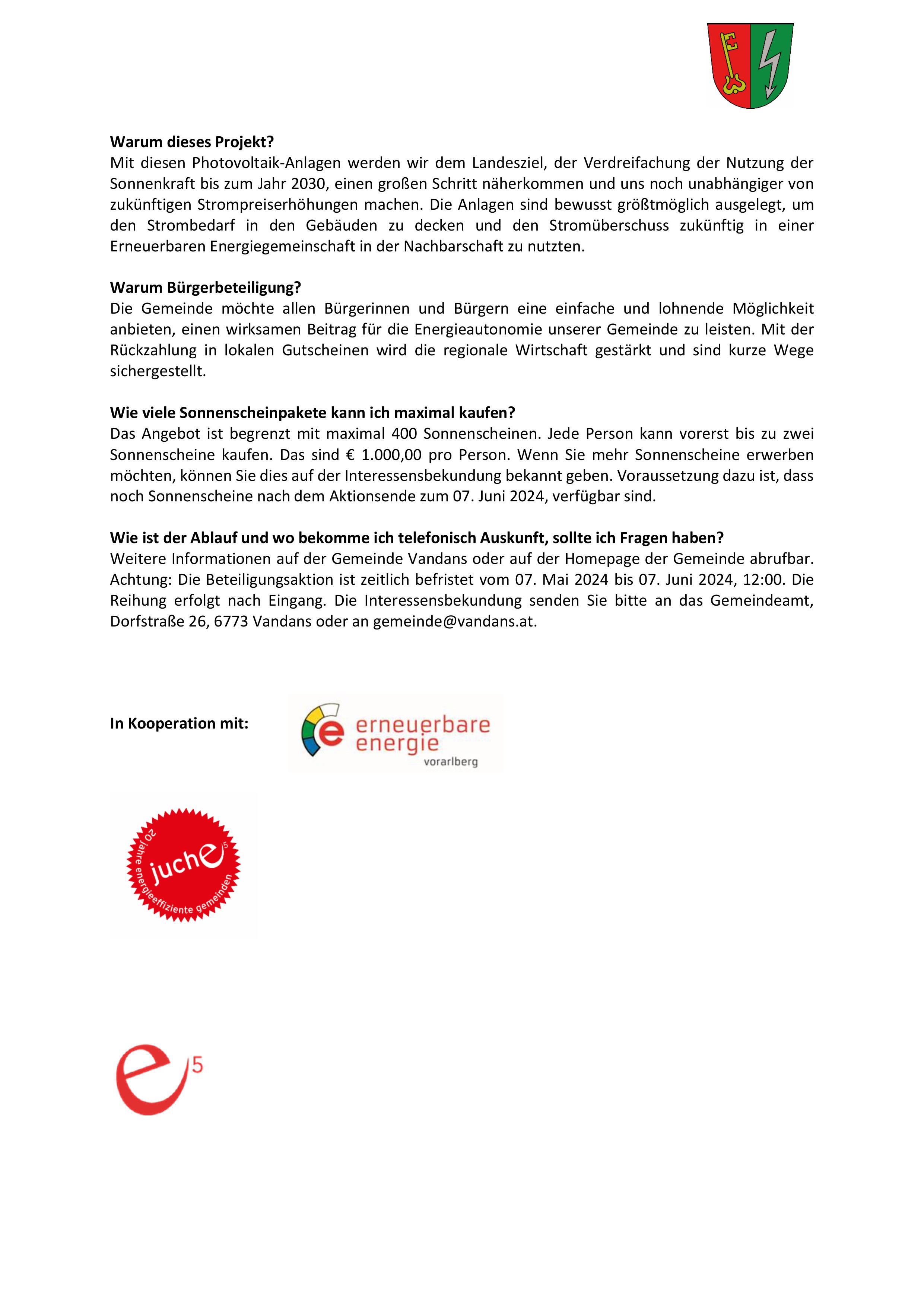 Die Gemeinde Vandans setzt sich beim e5 Landesprogramm für energieeffiziente Gemeinden für sorgsamen Umgang mit Energie und den Einsatz von heimischen, erneuerbaren Energieträgern zum Klimaschutz ein. Bereits zum 3. Mal wurde eine Bürgerbeteiligungsaktion mit dem Namen "Sonnenkraftwerk Rätikon III" im Zusammenhang mit der Errichtung der PV-Anlagen beim Gemeindeamt und beim Bildungscampus/Haus2 gestartet. Vandanser Bürgerinnen und Bürger konnten mit einem Beitrag von 500,00 Euro für die Dauer von 10 Jahren ein Photovoltaik-Modul (= 1 Sonnenschein) erwerben. Mit den laufenden Erträgen aus der Ökostromproduktion werden an die Bürgerinnen und Bürger ab dem 1. Betriebsjahr jährlich 60,00 Euro in Form einer Einkaufgutschein-Karte der WIMO oder jährlich 55,00 Euro in Bar für die Dauer von 10 Jahren ausbezahlt. Dieser Prozess wurde von der ARGE Erneuerbaren Energie begleitet.