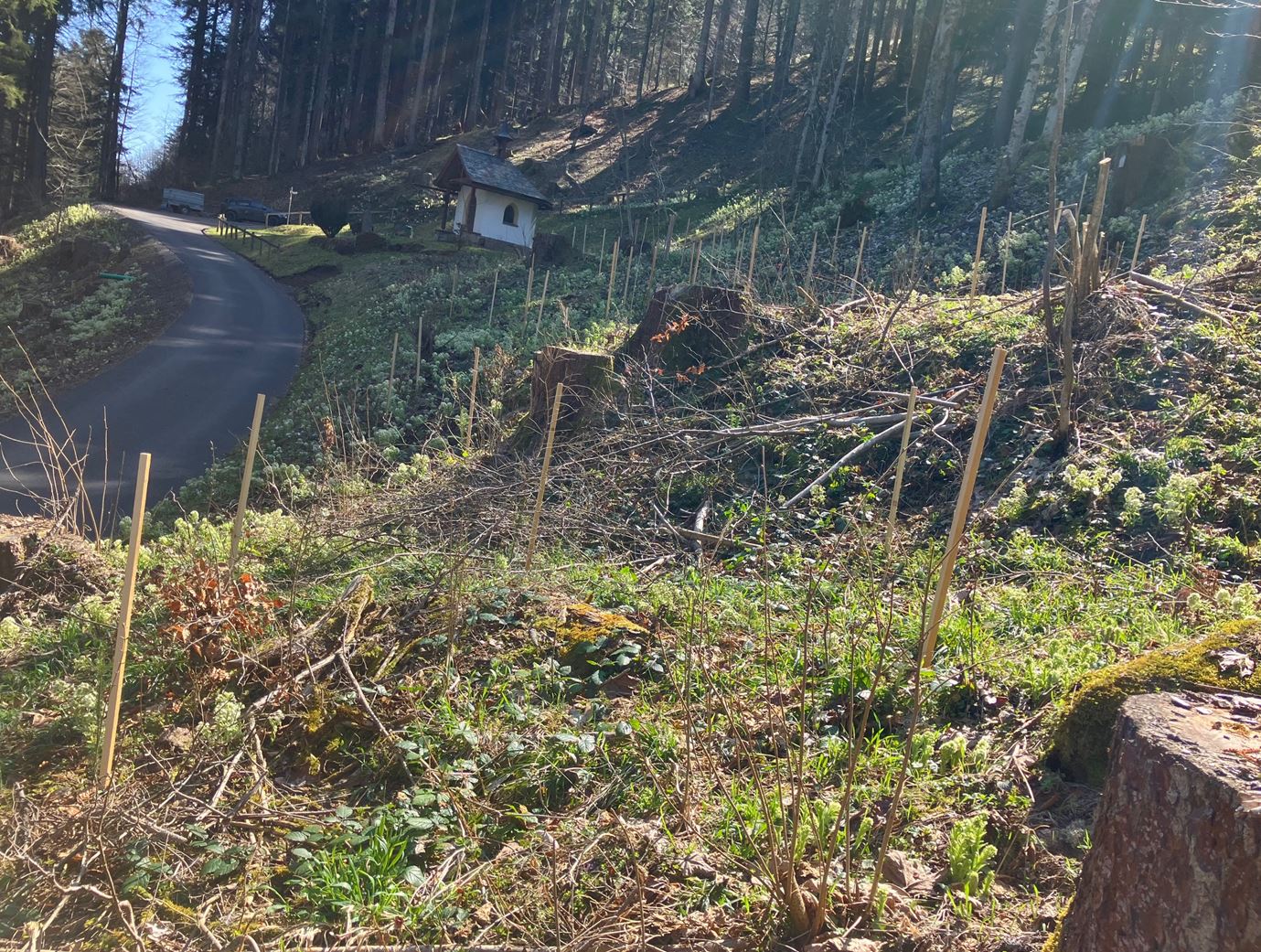 Auf den Grundstücken NR 895_5, NR 895_2 und NR 1068 wurde die Holznutzung im Jahr 2024 durchgeführt, Frühjahr 2025 Aufforstung mit 75 Stück Forstpflanzen;